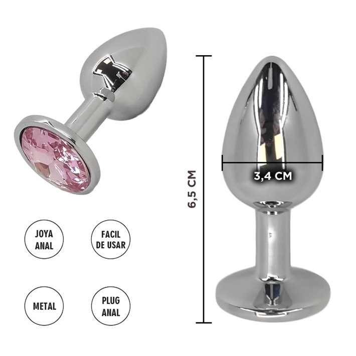Plug de metal SMALL con joya rosa, elegante plug anal hecho de metal brillante y deslizante, con un tamaño de 6.5 X 2.5 cm. Plug apto para principiantes y para experimentados en la práctica de la estimulación anal. Tiene una hermosa piedra rosa que lo hace llamativo y decorativo.