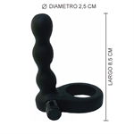 Anillo para doble penetración, fabricado en material flexible e hipoalergénico. Incluye bala vibradora y estimuladora que ayuda a la excitación y dilatación anal. El tamaño del dilatador es de 8.5 de largo y tiene un grosor de 2.5 cm en su parte más ancha.